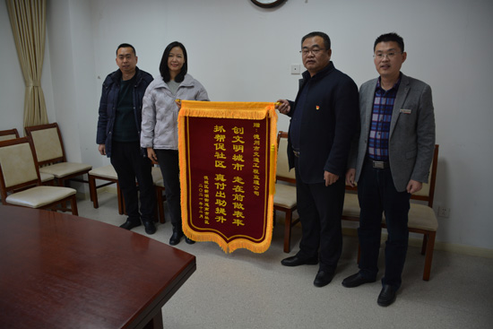 通過一年來交通監(jiān)理公司與南市社區(qū)各級(jí)領(lǐng)導(dǎo)的緊密協(xié)作及全體員工的辛勤付出,南市社區(qū)今年年底順利完成國家文明城市驗(yàn)收任務(wù)。12月29日,南市社區(qū)書記張艷紅一行三人來到公司對(duì)公司一年來創(chuàng)城工作成績給予了充分的肯定,并贈(zèng)送錦旗一面表示感謝。公司總經(jīng)理劉樹平、副總經(jīng)理鄭振豹進(jìn)行了接待,并表示在今后的創(chuàng)城工作中繼續(xù)發(fā)揚(yáng)國企擔(dān)當(dāng)精神,與社區(qū)緊密合作再創(chuàng)佳績。